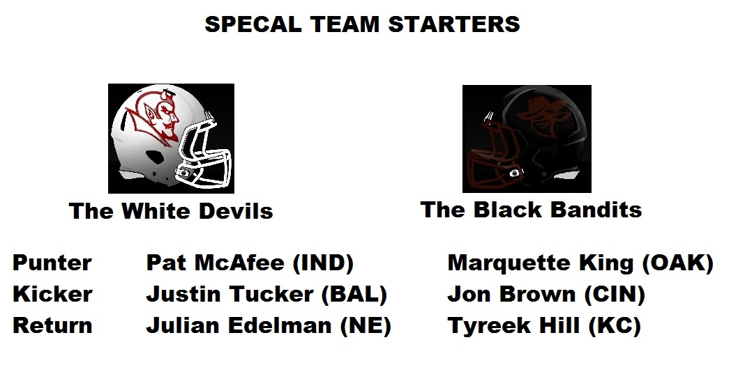 And lastly, we come to special teams. Absolutely no surprises here - Pat McAfee is pretty much the consensus pick for best punter in the League, and since Marquette King is the only black punter in professional football, he has no choice but to represent the Black Bandits. Of course, we had to look high and low for anything even remotely resembling a black kicker, and the only viable name is the Bengals' Jon Brown - a backup BACK-UP kicker who has never stepped foot on the field during a real NFL game. The same problem arose when the issue of return men came up; nobody's going to argue with convicted woman beater Tyreek Hill's designation on the Black Bandits, but finding a capable return man for the White Devils was about as difficult as winning a game of Arkanoid while wearing a set of boxing gloves. Although Edelman isn't a return man by trade, he's probably the fastest white guy in the League - which, by default, makes him the Whities' sacrificial lamb on kick-off. The field goal game is a lock for the White Devils, but when it comes to handling kick returns, you have to give the nod to the Black Bandits - thus, I've no choice but to call this one a wash.