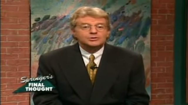 Yeah, it's a pretty smarmy way to end a half hour of trailer trash and ghetto niggaz (or, perhaps, crappy actors pretending to be trailer trash and ghetto niggaz) beating one another up and showing their stretch-mark-covered titties to the world, but hey, this Springer guy - who has now been hosting the program for 25 years - knows not to mess with a winning equation. If all it takes is a minute of half-assed pseudo-intellectual drivel to offset the unabashed exploitation of poor and possibly retarded Americans for cheap, mean-spirited entertainment, I say keeping running with it, Jerry-Boy - the fact you're STILL on the air today is more than enough proof middle America is A-OK with your shtick.