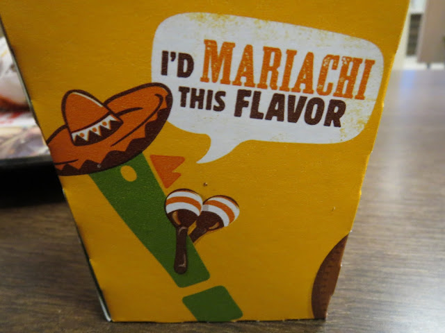 Beyond the gloriously stereotypical depiction of a Mexican chicken (complete with a sombrero and maracas), the package is just littered with terrible ethnic puns. Oh, the "I'd Mariachi this flavor" joke above is bad, but I assure you the ones on the other four sides of the packaging are just as groan-inducing, if not worse. How bad are we talking here? "These jalapeƱo chicken fries are la bomba" - that's how fuckin' bad.