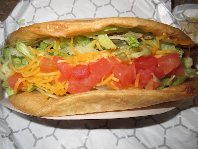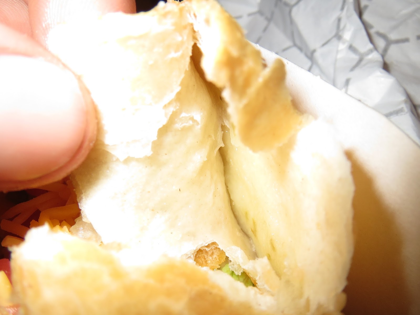 For the most part, the product is basically just your standard chalupa. In fact, just looking at the product, there is really no way to distinguish it from a standard 'lupa. It is not until you actually hold this sumbitch in your hand that you really find out this is a whole new menu offering. The most obvious distinguishing characteristic is that this thing is heavy, feeling almost twice as hefty as the regular chalupa. Interestingly enough, almost all of the product's weight is centralized toward the bottom, which has this weird rectangular-shaped base. In fact, it is so flat you can easily use it to stand the Quesalupa upright without any of its contents tipping over. And hey, speaking of contents...