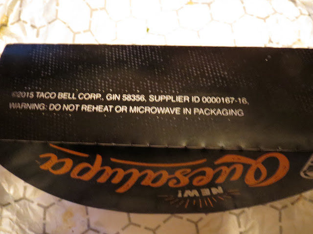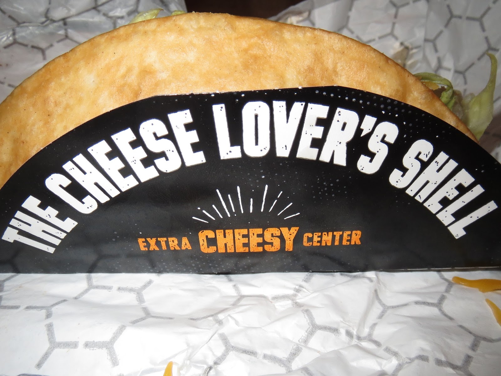 As soon as you unwrap the packaging, you'll observe the 'lupa is wrapped up in a secondary wrapper, a'la the Doritos Locos Tacos. On one side it mentions the product's name (in case you have Alzheimer's and need to be reminded of what you're chewing at all times) and on the other, the product extols itself as "the cheese lover's shell" with an "extra cheesy center." You just know something has to have a lot of cheese on it and inside it, if it uses the word cheese twice on one piece of cardboard.