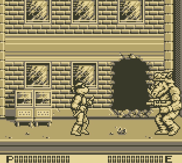 This time around, there are six stages, all of which are much larger than the levels in the first Game Boy offering. As in the first game, navigating the stages requires quite a bit of platforming savvy,and lightning quick reflexes are a must as well. The enemy A.I. in this game is much better than it was in the first go-around, and all in all, this is a significantly more challenging sequel in every way. The ability to chuck ninja stars has been excised, but the trade off is slightly faster attacks and greater range for all four playable characters. As before, you'll get to trade blows with scores and scores of Klan-looking ninjas en route to boss battles against the usual assortment of TMNT baddies; newcomers for this one include that pizza monster thing that somehow avoided a lawsuit from H.R. Giger and General Traag - you know, that rocky motherfucker from Dimension X. Oh, and all of the returning boss enemies have received major graphical and attack upgrades, with the final boss fight against Krang in Back from the Sewers making the final boss fight in the first game look like a Game Genie-assisted run against Bowser from the first Super Mario game.