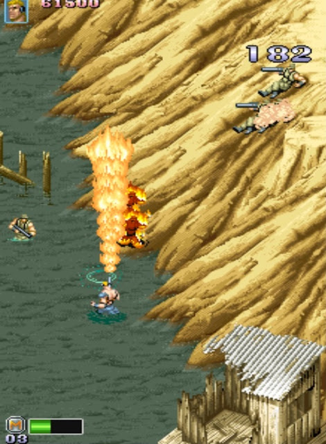 Stage four starts off in a lagoon, and here you finally get to play around with the flamethrower ( and take it from a retro gaming pro - incinerating foes with this sucker is every bit as enjoyable as charging up the Blue Bomber's arm cannon in Mega Man 4 and blasting a Volvo-sized hole in whatever Robo-Fucker had the misfortune of standing in your way.) There's a new vehicle introduced (a boat) and the final boss fight is against, well, an even bigger boat that has an impossible number of guns on it. Estimated number of quarters you will need to vanquish it: four dollars' worth.