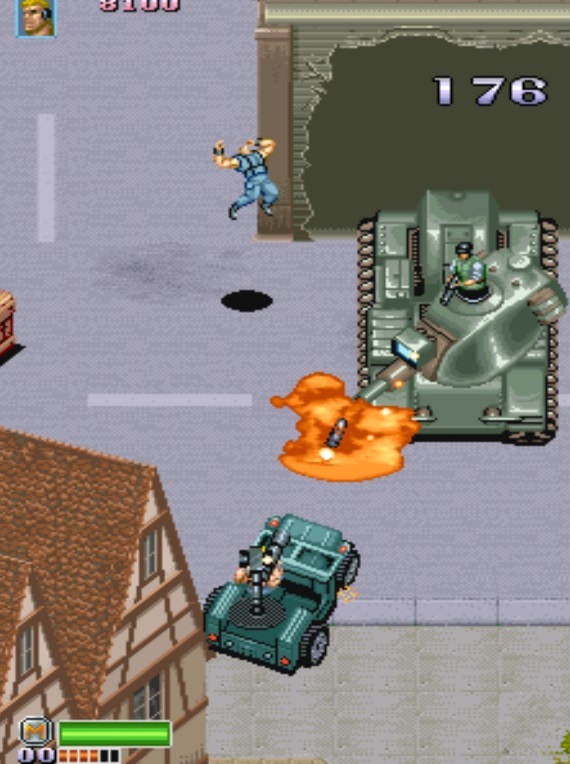 The second level begins in sort of a Bavarian-looking village. You get ambushed by some dudes in a Jeep, but wait a minute, what is this little development? That's right, amigos, 11 years before Halo THIS GAME gave you the ability to commandeer enemy weapons and blow da' fuck outta' everything you encounter. Of course, your ride won't last too long, since you're about to find yourself knee-deep in a battlefield glutted with tanks and snipers on patrol towers. So yeah, you pretty much have to use your bombs to escape, and once you do, it's time for a boss battle against an EVEN BIGGER TANK. At this point, even the most hardcore of gamers have already dumped about six quarters into the machine, and trust me, there's going to be a whole hell of a lot more coinage getting plunked in stage 3.
