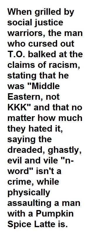 On Sept. 15, probable NFL Hall of Famer Terrell Owens apparently had an altercation outside a Starbucks in Brentwood, California -- an episode which, according to multiple accounts, entailed allegations of tripping and hot beverages to the face. Rather than focus on the possibility that the team-hopping wide receiver who may or may not have attempted to kill himself back in '06 assaulted a man twice, TMZ America has instead latched onto a video recording which shows the allegedly attacked confronting T.O., threatening to "murder" him and describing him as, and I cannot stress just how much this is a direct quote, "a knuckle-running, spear-chucking, monkey-ass looking motherfucker." When grilled by social justice warriors, the man who cursed out T.O. balked at the claims of racism, stating that he was "Middle Eastern, not KKK" and that no matter how much they hated it, saying the dreaded, ghastly, evil and vile "n-word" isn't a crime, while physically assaulting a man with a Pumpkin Spice Latte is.