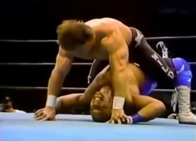 Norton with a shitty flying clothesline. Tenay says Norton and Road Warrior Hawk went to the same high school and wonders what it would have been like to be bullied by them. Now Hash is working the arm again. Eric B. tells a story about one time Norton allegedly beat up Oakland Raiders receiver Dave Casper at the Hubert H. Humphrey Metrodome. Hash kicks Norton in the stomach and he no sells it. Norton hits him with a clothesline, but it's only worth a two. Norton with a facelock then a neckbreaker. Shit, this match sucks. Norton with a bodyslam. Then an elbow drop. And another. Norton looking for a powerbomb. Hash counters with a back-body drop, followed by a dropkick. Hash working for another over-the-shoulder armbar. Onoo chides Norton for grabbing his opponent's hair and scratching his eyes like "Americans do when they are in trouble." Norton with a backbreaker. He goes up top and lands a Vader-ish splash. Just a two. Norton punching Hash in the midsection. Norton works a sleeperhold. He gives up the submission and just starts stomping him. Holy fuck, can you imagine the WWE having a relationship with New Japan this chummy today? You know, one in which they not only cooperate with another promotion, but actually agree to let THEIR talent look good against them, too??