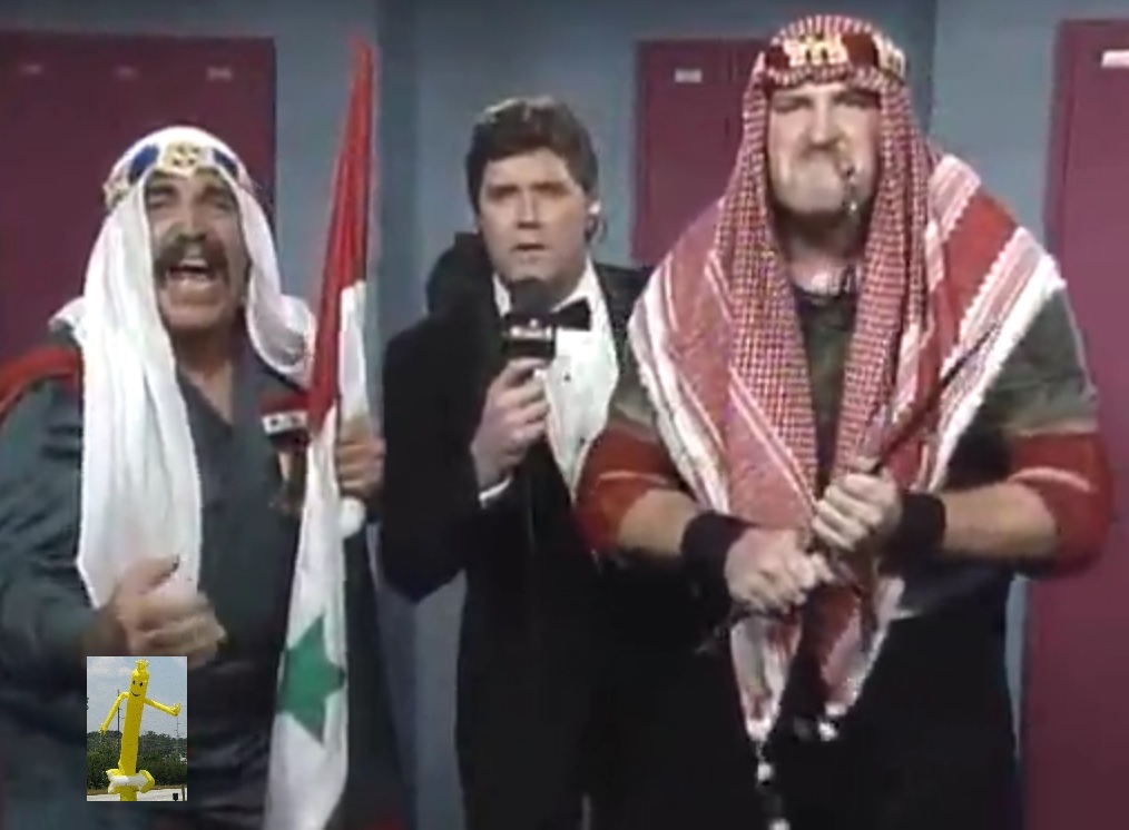 Mooney reads a statement from WWF President Jack Tunney, who says Slaughter's views on the Gulf War do not represent the company, or even Arab people in general ... which is immediately followed by previously recorded footage of the Iron Sheik saying a bunch of menacing-sounding Arabic shit on Brother Love's talk show.