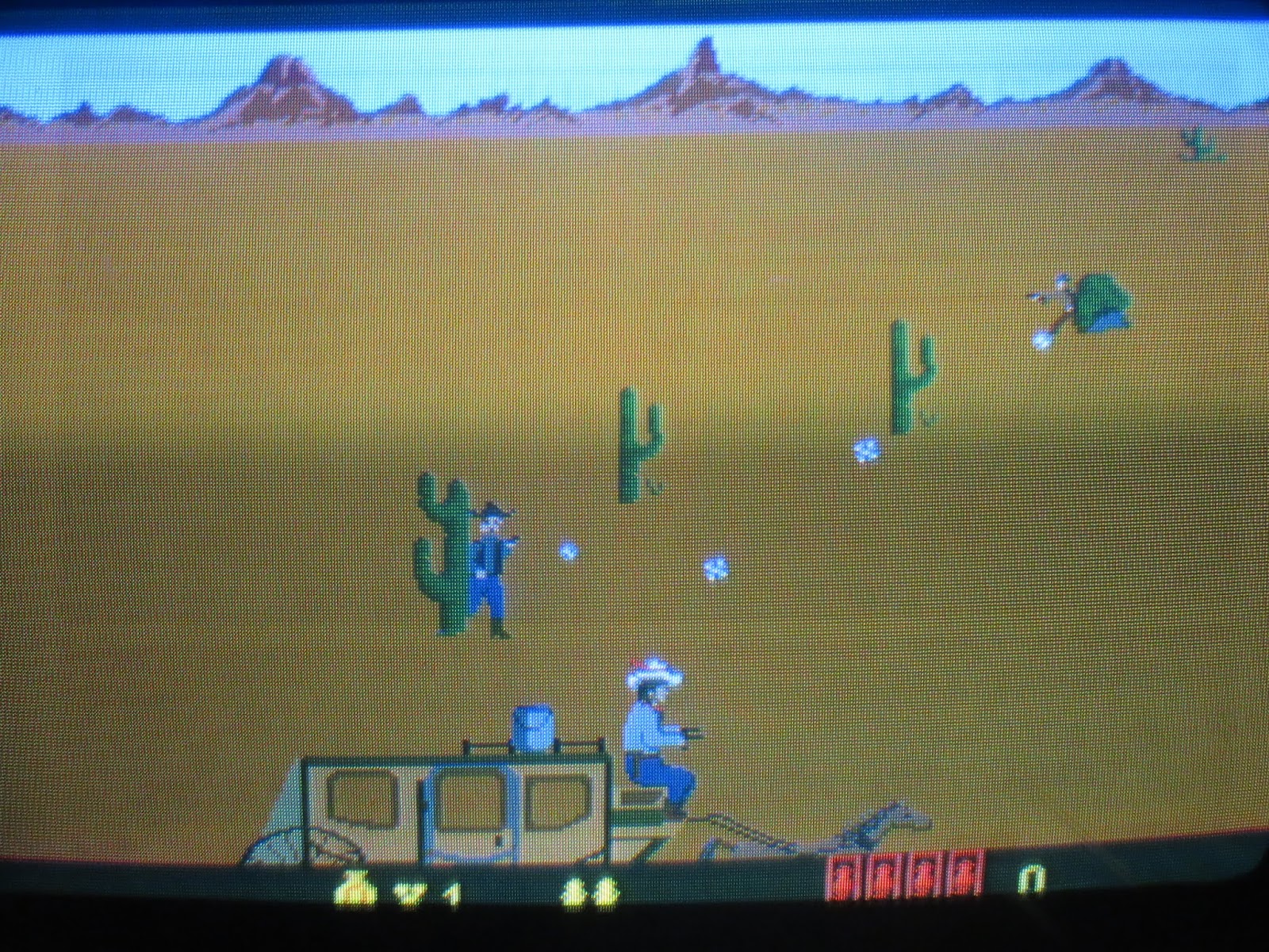 So yeah, graphically, the game is pretty crummy-looking, but gameplay-wise it's actually pretty fun. It's essentially a feature-length escort mission, where you have to shoot all the bad cowboys and Injuns before they pop a cap in the wagon-driver's ass (and yes, you can shoot the bullets out of mid-air, if you have to.) All in all, the action here is quite intense, and the precision on the light gun is astonishingly well-calibrated considering the supremely outdated hardware. It may not be a genre-defining classic, but there's no denying Cheyenne is a very well-made — and strangely addictive — coin-op experience for the lifetime NRA member in all of us.