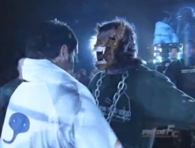 Not gonna' lie - I STILL get goosebumps when the old school UFC theme start blaring over the Tokyo Dome. The Iceman comes out wearing a UFC hockey jersey. And Dana White is doing co-commentary duties. LOL at Dana clapping like Eric Bischoff when Chuck walks past him. And Rampage does indeed come out to that awesome fucking in-house rap track from the earlier video package. He's wearing a lucha libre mask and his trademark chains. Bas refers to his regalia as "a tumor," and Dana says he's about to "get lit up." Also - fuck, do I miss hearing Bas Rutten in the announce booth. Bellator needs to hire him ASAP. Apparently, one of Jackson's sponsors is something called "Serious Pimp," which I'm totally going to have to Google one day.