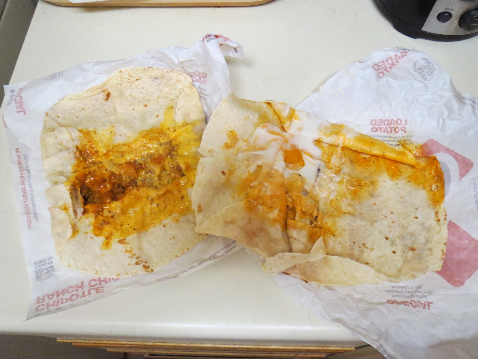 The product itself, not surprisingly, is quite oily. As soon as I opened my wrapper, a thick wad of orange goop emerged from the paper, resulting in a big, fat glob of half chipotle sauce/half ranch dressing goo splattering on my counter-top. Clearly, for those of you with a disdain for sloppy foods, you might want to pack an additional fork and quite a few extra napkins before you go to town on this one.
