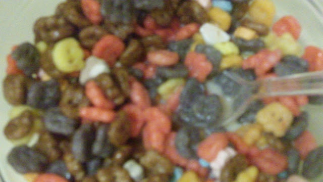 And for good measure, here's an up-close shot of the Transylvanian pell-mell. If you're wondering what the dish tasted like, it's pretty hard to describe. Peculiarly, I don't think any one flavor took dominance over the others, so I could actually taste each and every individual cereal as I chewed it WITHOUT the combination as a whole merging into some weird-ass torrent of orange-choco-cherry-berry. It's a hard sensation to describe, I know, but trust me -- it's a really unique and, even stranger --not really all that gross of one, either.
