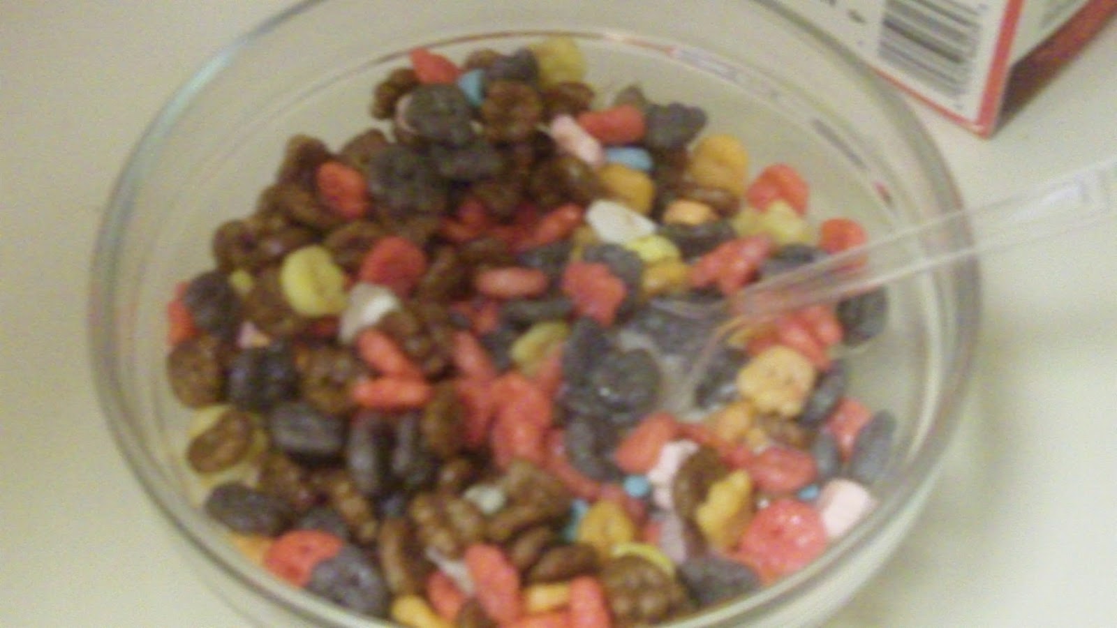 While strawberry flavored cereals really aren't that atypical, you really don't see that many cherry-flavored cereals on store shelves. On the surface, it's somewhat understandable -- traditionally, cherry has been one of the harder fruit flavors to recreate faithfully in artificial breakfast form -- but Frute Brute actually does taste pretty damn delicious, with a sweet cherry flavor that, while definitely noticeable, isn't too overwhelming, either. Really, that's the great thing, gustatorily, about these GM cereals -- it's not just that they have decent fruit flavors, it's the fact that they have such fine-tuned flavors that DON'T taste like novelty air-fresheners. The flavor chemists at GM deserve a pay raise, I tell you what.