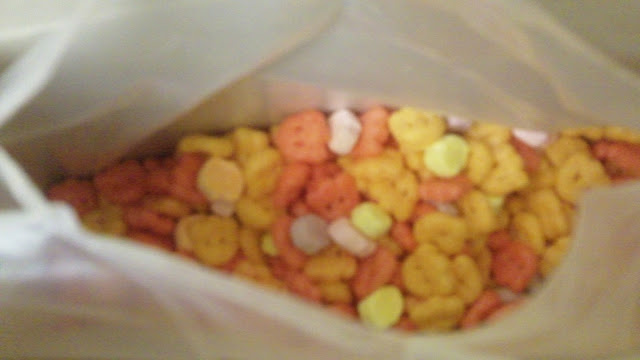 And here's the end dividend of dumping five boxes of limited-time only retro cereal into one translucent container. There's definitely a Fruity Pebbles vibe going on here, but the cereal bits certainly appear a whole lot bulkier. The hard part after this, I guess, is finding a way to begin my mornings WITHOUT slaking upon a heaping bowl of artificially flavored rainbow ghosts once these things officially go out of season.
