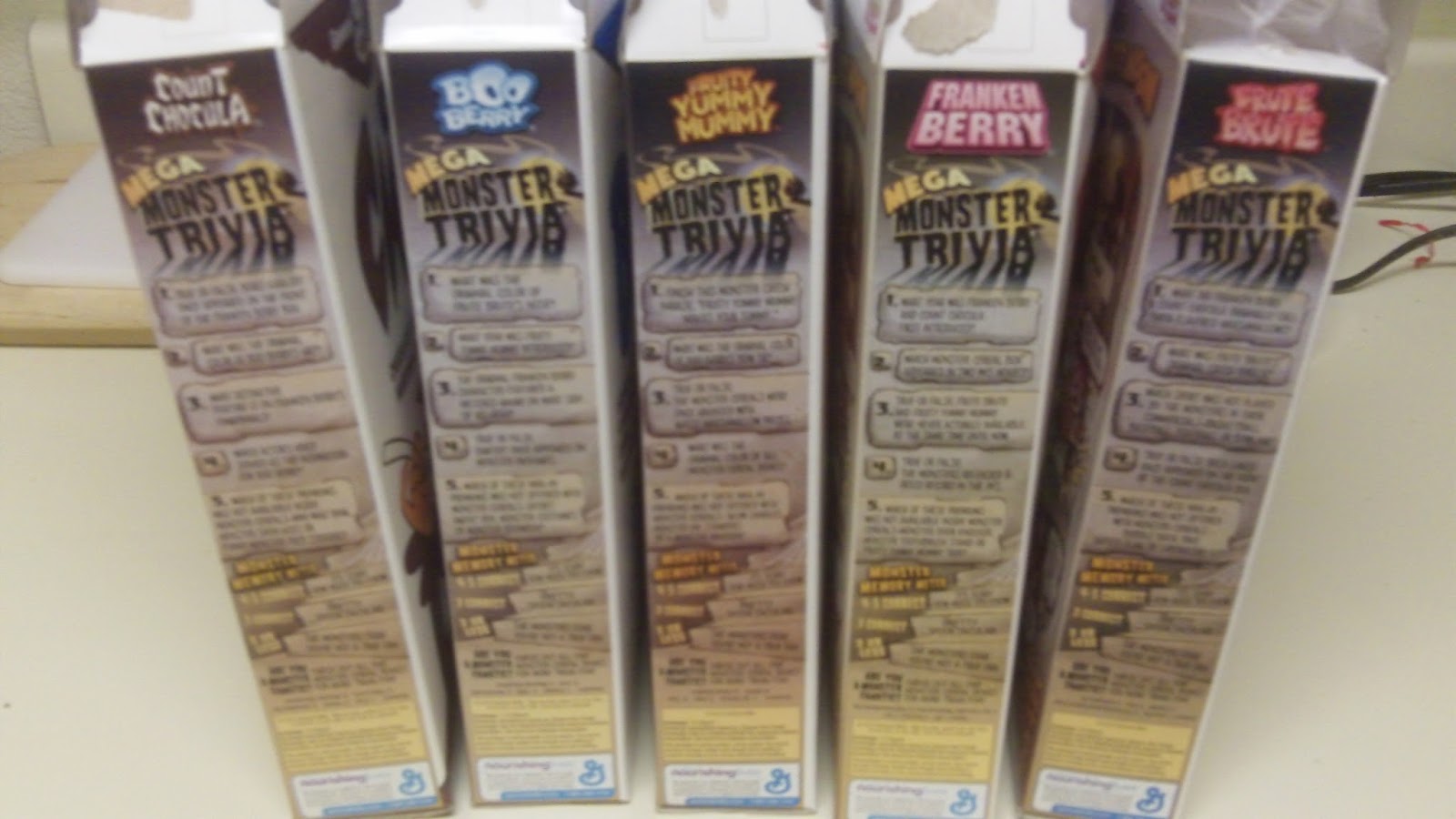 And here's our rich panoply of multi-hued, multi-flavored monster cereals. As you can no doubt see, there's something of a "dark to lightest" spectrum going on here, with Count Chocula serving as one endcap of the rainbow and Yummy Mummy acting as the other.