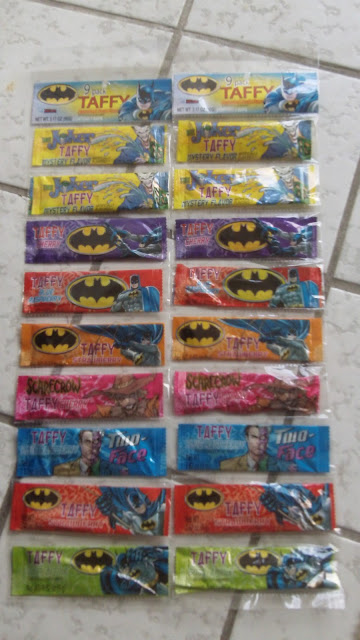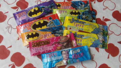 Strolling down the aisles of the local Dollar Tree, I observed this set of nine - count ‘em, NINE - sealed candies, which is remarkable for two primary reasons. First and foremost, that’s an absolute shit ton of candy for just a dollar, and I’ll be several shades of darned if the artwork on the packages wasn’t half-way awesome-looking. And for four measly quarters, you bet your sweet derrière that I’ll take a gamble on a sugary comestible that has the Scarecrow’s face on it.