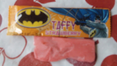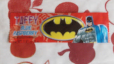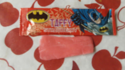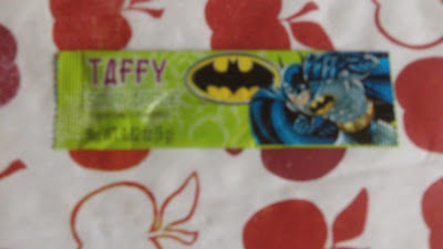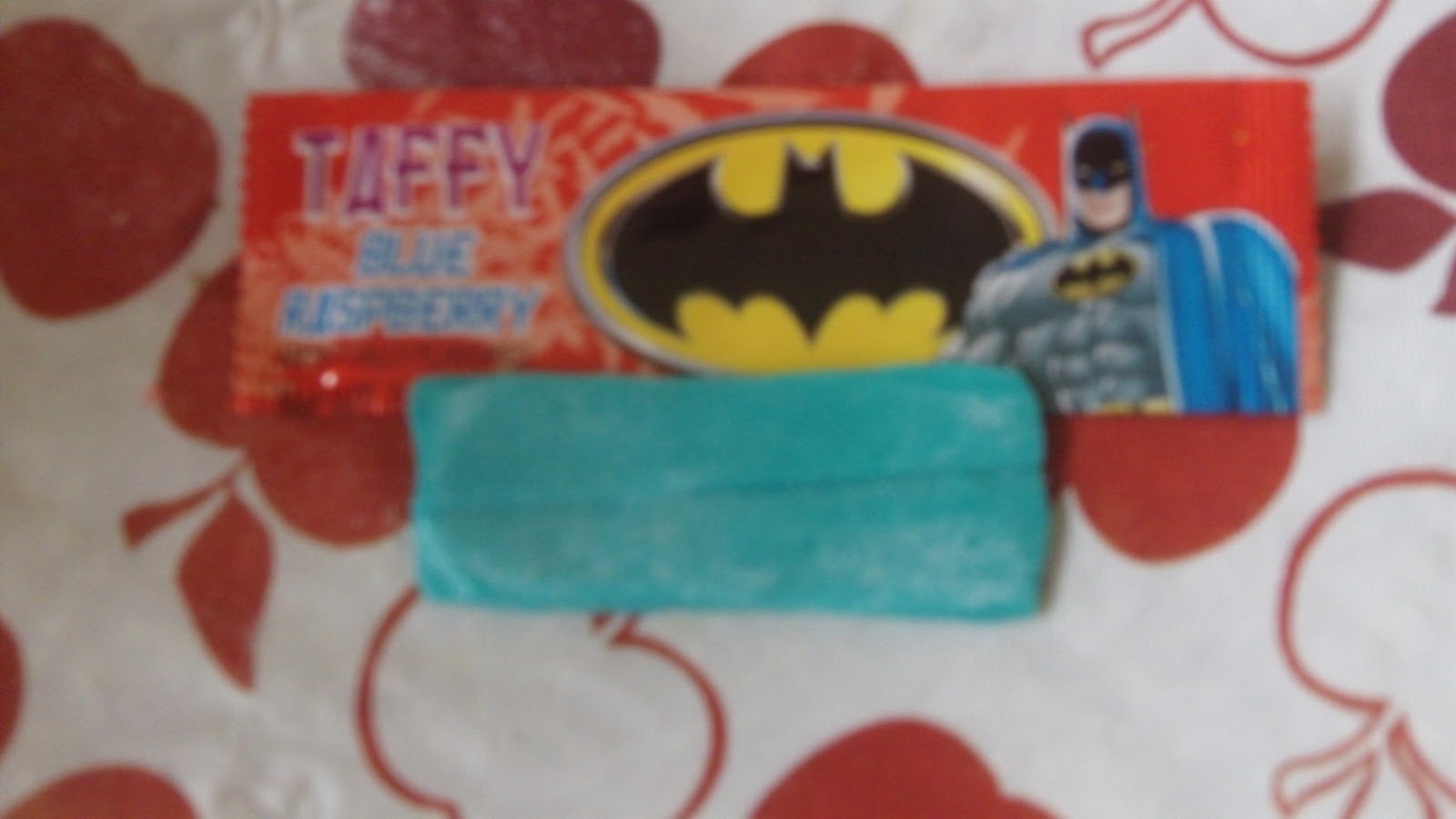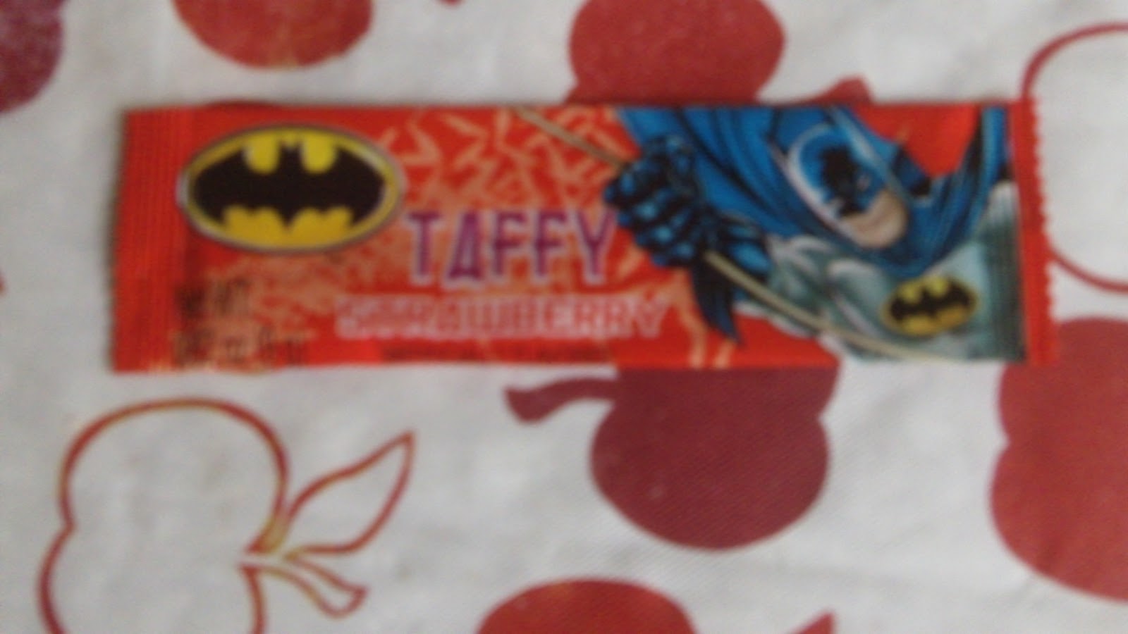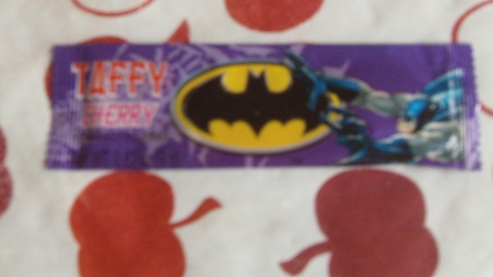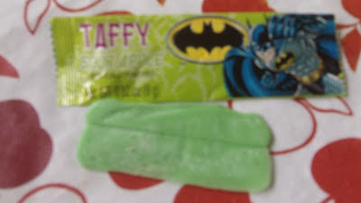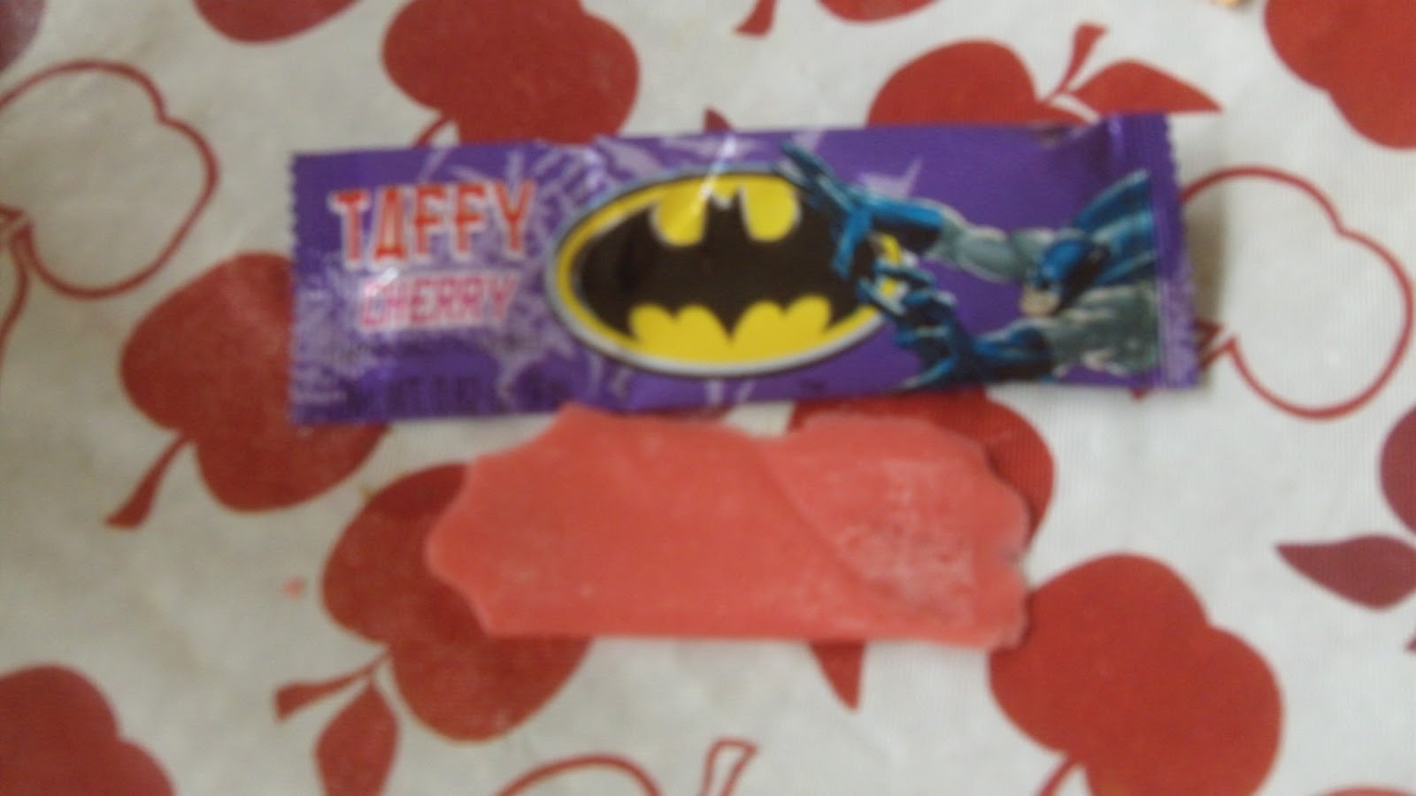 So, uh, yeah, the sour apple taffy. It’s green, It’s also really powdery, and true to the nomenclature, quite tart. I guess my favorite thing about this one is that it has Batman on the package, rearing back to cold-cock something. Which is a little fitting, since eating sour-apple flavored things is only slightly more desirable than getting socked in the jaw by a psychopathic JFK, Jr.