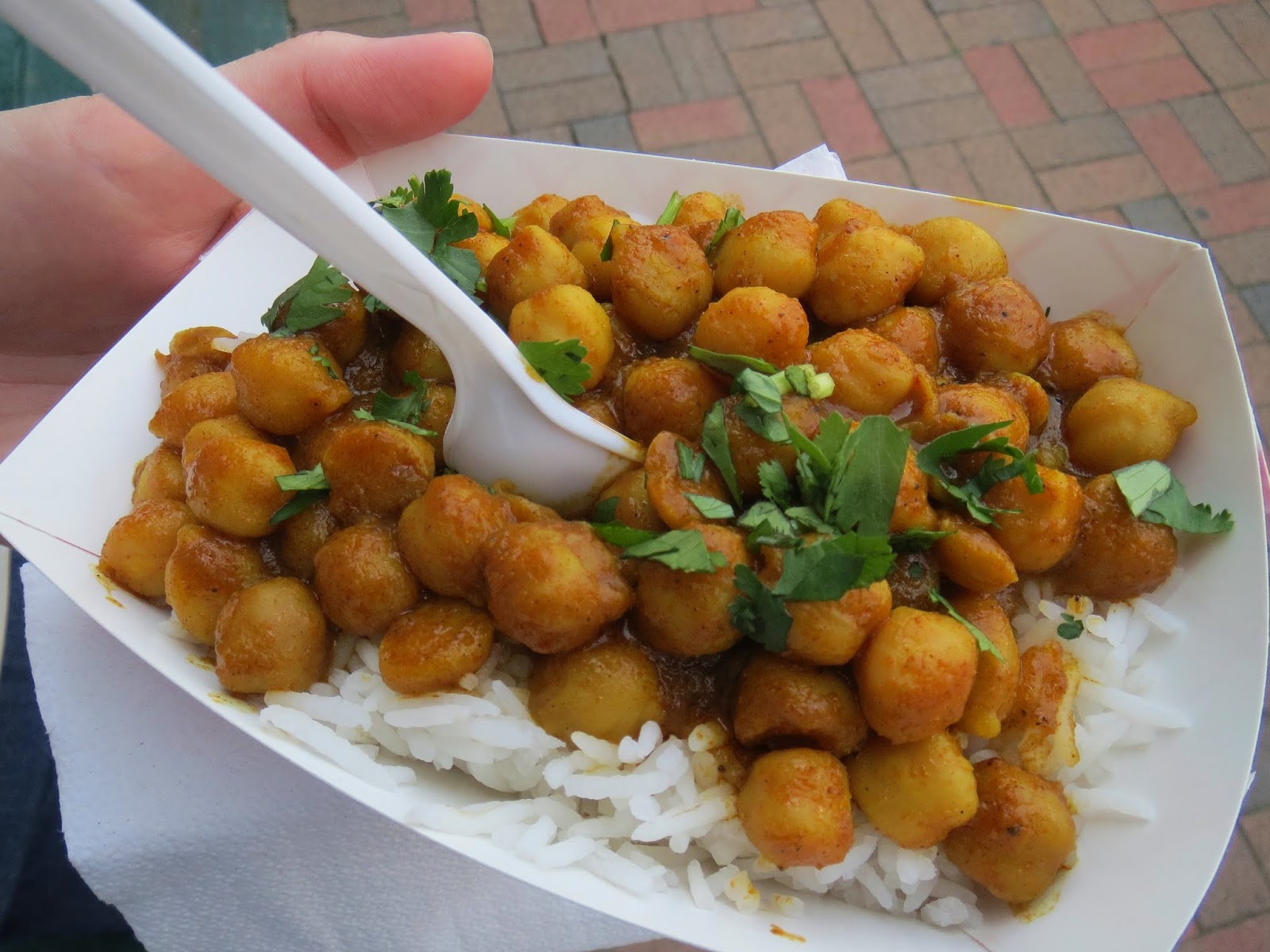 Ok, so it's a little bit too big to be described as a sample tray, but its definitely not a full restaurant-sized serving either. I'm not sure if I should give the truck operators bonus points for adding the extra grub or detract them from disobeying the "sample portions only" diktat, but at the end of the day? I got me some delicious chana masala, which in addition to being filling and flavorful, was given to me by a man with a very pronounced, albeit suspicious, Australian accent. If you think either of those things are negatives in my book, you haven't been paying  good attention to the blog, clearly.