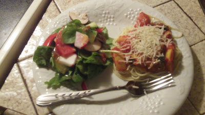 Now’s a good time to collect your side items. Salads usually go pretty well with Italian food, and since synthetic Parmesan cheese was on sale at ALDI that afternoon…well, two and two still makes four, don’t it?