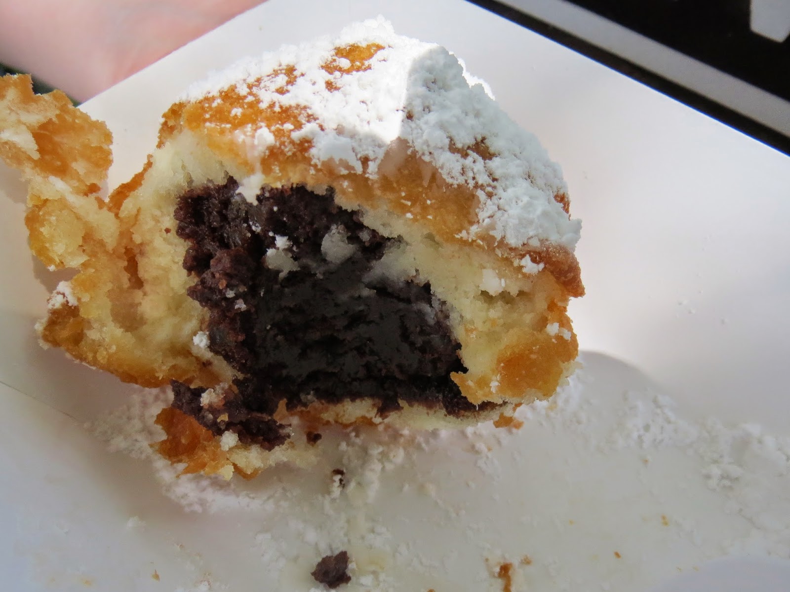 And here's the brownie circuitry that belies the carnival fair exoskeleton. It's pretty hard to describe what the actual dish tasted like, because it was comprised of such strangely parallel textures. The outer layer tasted more or less like your standard funnel cake, but the brownie itself -- perhaps inundated by the granules of powdery sugary, tasted almost acidly sweet, if that makes any sense. Don't get me wrong, it was delicious, but at the same time, it also tasted so gustatorily unusual. Indeed, my curiosity is piqued for their "Fried Oreos," and then some.