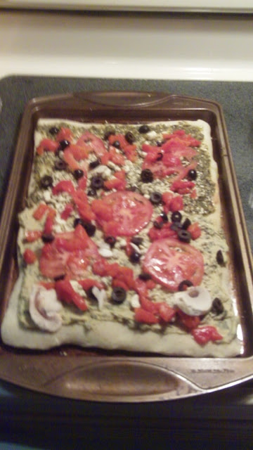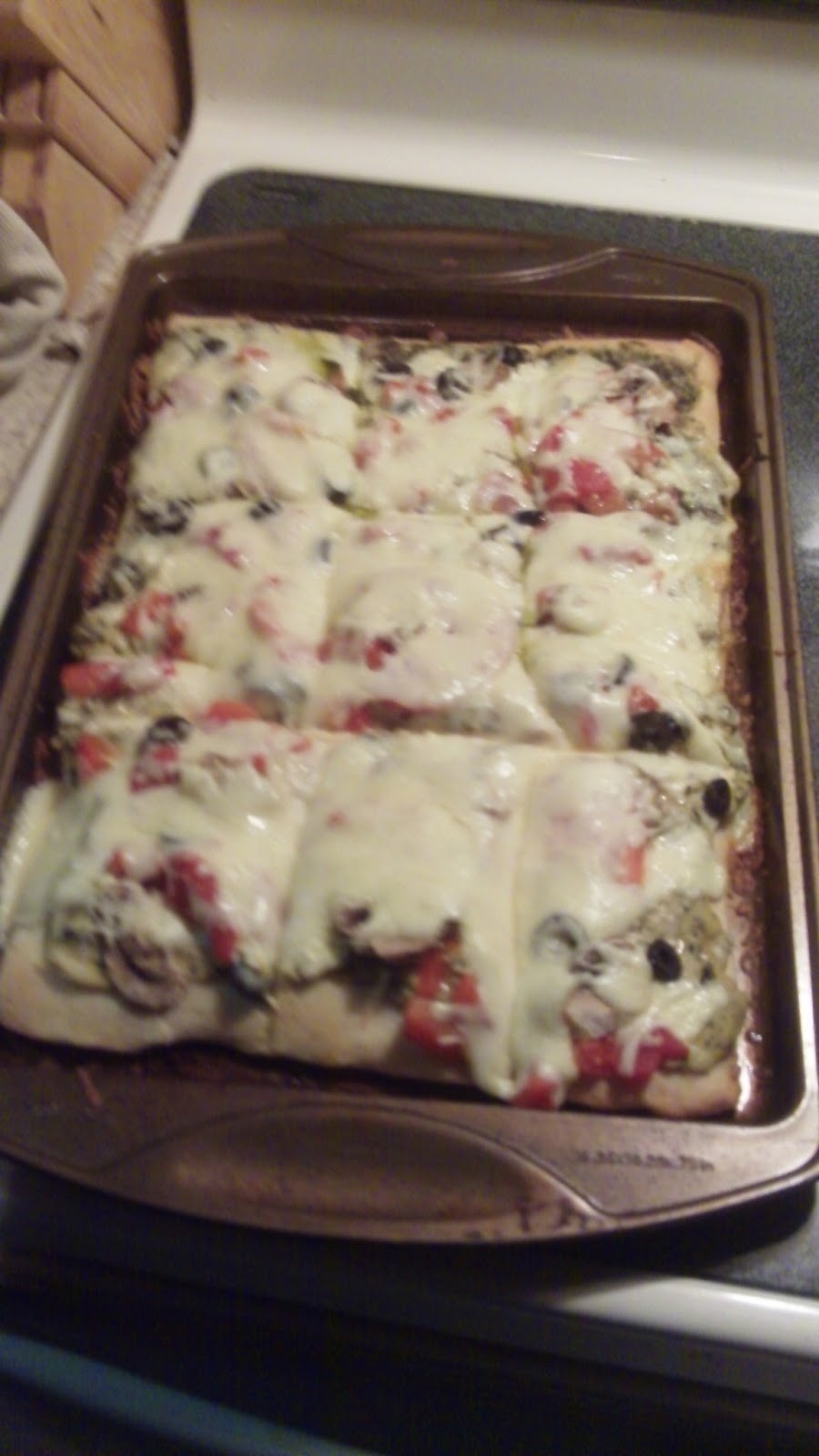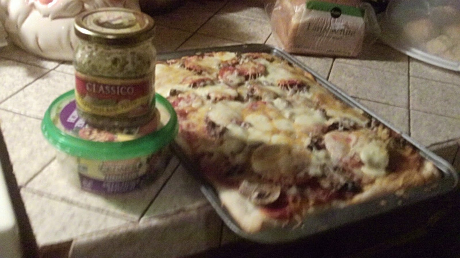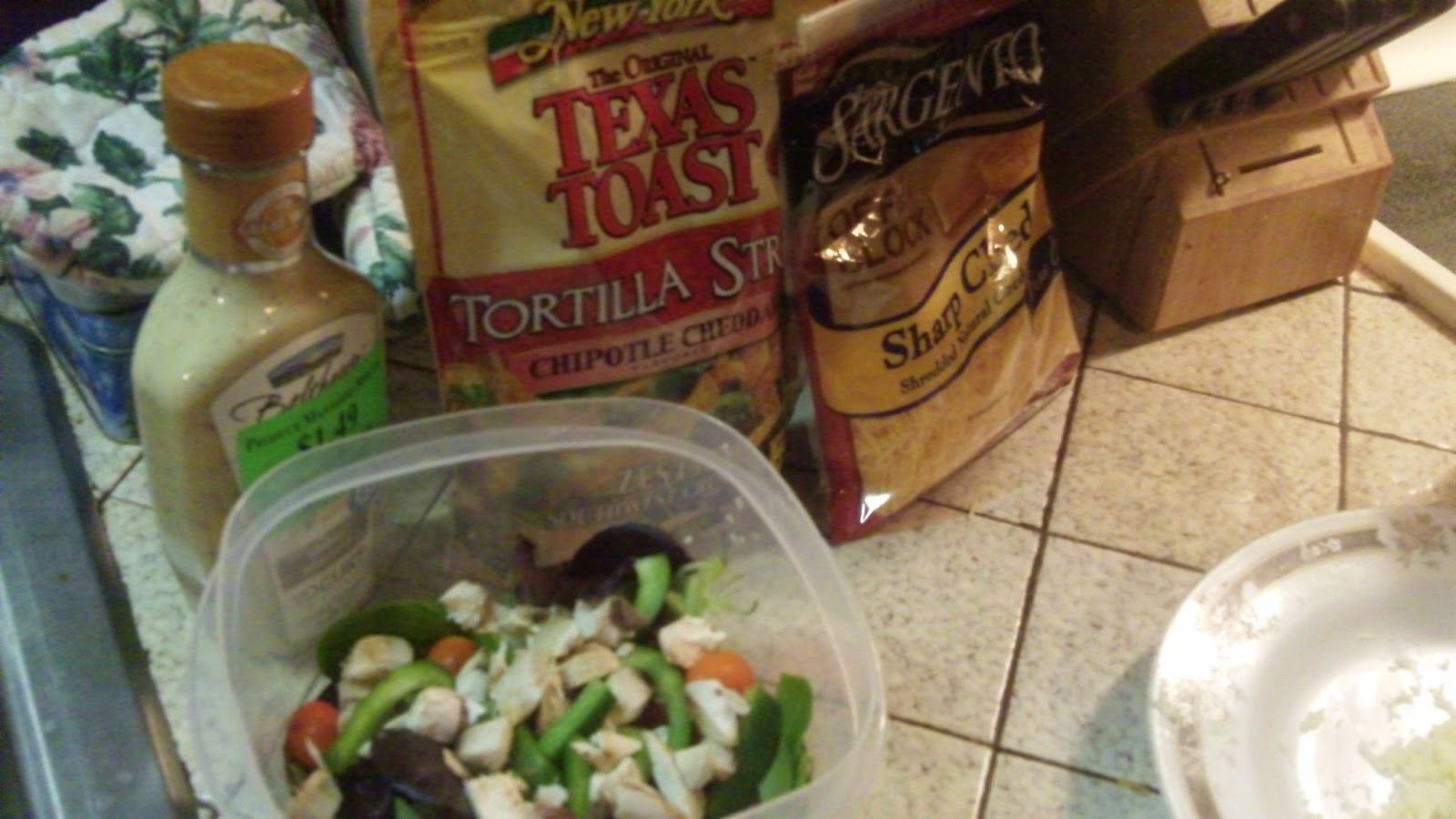 Red peppers and feta aren’t huge favorites with everybody, but I’d suggest heaping them on the grocery list, anyway. They really give the overall pizza a tart and spicy kick that it wouldn’t have otherwise, and it really adds to the experience. Per me, anyway. And a nice side salad always goes well with homemade pizza; similarly, it gives you somewhere to chunk all of your excess mushrooms and peppers, too. BONUS FRUGAL POINTS ON THE SALAD DRESSING: we got it for a reduced price, simply because it was like three minutes away from expiring.