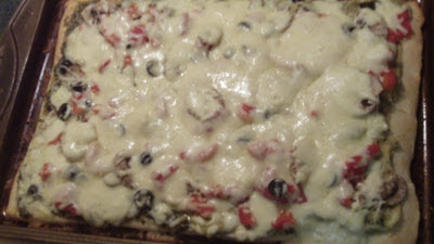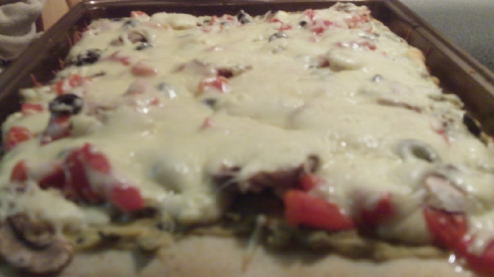 Regarding recommended toppings: portabella mushrooms are always nice, and you know I dig me some black olives. Ever the traditionalist, I reckon it doesn’t hurt to have SOME form of tomato included, so if you have some nice, pulpy maters, I say toss ‘em aboard. Remember: you’re just going to bury this stuff in mozzarella anyway, so who cares if it doesn’t seem like it will gel with everything else, anyway?