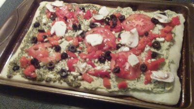 The ingredients, you’re probably wondering? Well, let’s take it from the top. You’re going to need some dough, but probably not that really awesome home-tossed stuff, because unless you have several hours on hand to adequately unroll that shit, it’s probably going to prevent you from eating the final product within the next 18 or so hours. Really, the world is your oyster as far as possible toppings, but the three things that are absolutely PIVOTAL here are pesto (preferably of the green variety), hummus (really, any variation will do, but I opted for a mix with some lemon and basil seasonings) and of course, white cheese. So much white cheese, your kitchen floor will end up looking like an icy tundra (because snow is often white, which is the same color of the cheese you are putting on your pizza.)