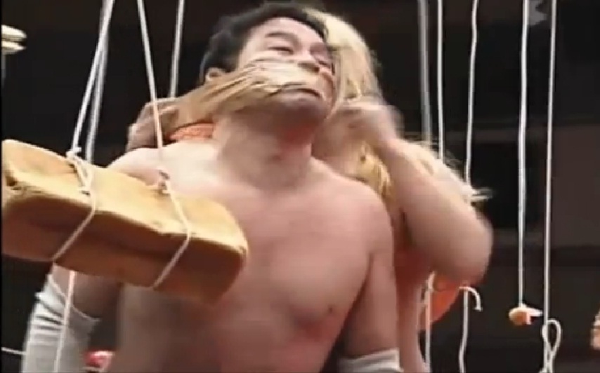 In this BJPW "Scorpion and Cactus Death Match" from 1996, Mitsuhiro Matsunaga and Shoji Nakamaki do battle inside an almost indescribable arena of abstract mayhem. On adjacent sides of the ring, there are gigantic, uprooted cacti serving as turnbuckle posts, while these completely leafless wooden sticks (think, a really, really dead houseplant that's about six feet tall) are positioned on the other posts. And in the middle of the ring? A gigantic, glass box filled with  (presumably) imported scorpions. Now, take a wild guess how the victor is supposed to win this match-up?