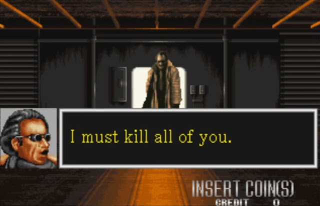 But what a minute! Another cutscene/title card lets us know we aren't finished with "alien boss," quite yet, as that spindly little sumbitch hops out of its liquid metal tomb and your character ACTUALLY says "oh, shit." OK, that's pretty mundane for the Grand Theft Auto 5 generation, but to include that in an arcade game in 1993 was beyond ballsy for Sega. I mean, rippin' bitches' spinal cords out in Mortal Kombat is one thing, but actually hearing the dreaded "S" word in a coin-op? That is literally the most punk rock thing I've ever heard, and it only serves to make me love Sega a million billion times more than I already do (which is still a lot, in case you were wondering.)