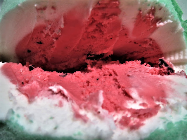 Oh, and as for the taste, you might be wondering? Eh, it's pretty solid. The outside lime-green dressing has a noticeable citrus sorbet taste, which isn't my favorite flavor in the world, although the interior pink stuff does indeed have a fairly faithful (if not overly sugary) artificial watermelon taste (still, it tops Pop-Tarts' take on the flavor like a motherfucker.) Oddly enough, the white stuff doesn't taste like vanilla at all - it's basically just a flavorless sponge that soaks up the combined taste of the lemon and watermelon sorbets. But yeah, the chocolate watermelon seeds taste just like big chunks of dark chocolate, so I guess that kinda' sorta' offsets some of the other negatives.