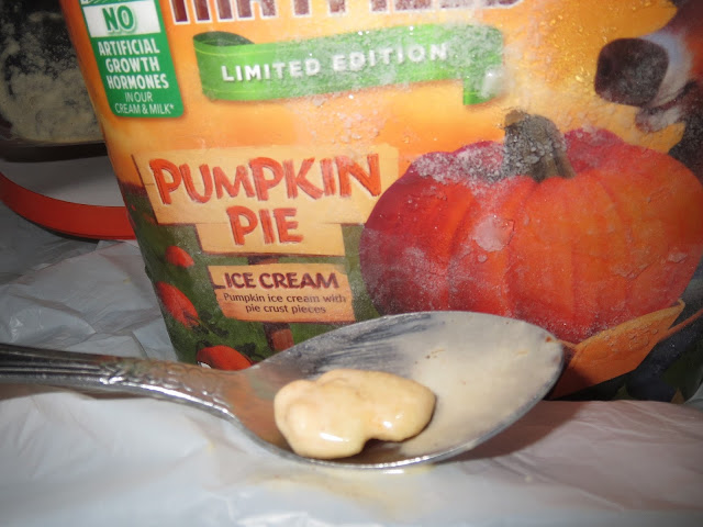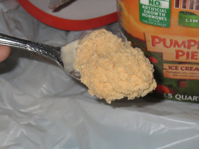 Because you just can't market a regular old ice cream anymore, the product does come with a few chunks of pumpkin pie crust. Essentially, they are just fragments of graham crackers that reside somewhere between "super duper crunchy and crispy" and "really soggy and flavorless." Really, it's a crap shoot every time you scoop up a piece - sometimes, you get a sliver of deliciousness and others, you almost want to spit out your spoonful because you have no idea what the hell it is you are running your tongue across.