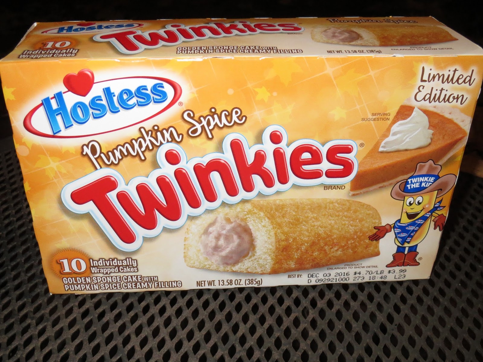 OK, so it smells pumpkin spicy, but does it really taste like a PSL wrapped around a spongy snack cake? Well, a little, but it's more of that old "cinnamon and nutmeg" two-fer than it is the quasi-authentic pumpkin pie flavor and mouthfeel you'd get out of something like the Mayfield ice cream discussed a few graphs back. Also, you really can't tell in the photo above, but the creme itself is this weird grey hue. It's just about the most inedible looking color you could paint anything, and though I understand Hostess' decision to dye the proprietary goop a different shade to commemorate the holiday, it's definitely an aesthetic that makes you double think pushing it down your gullet. Tsk, tsk, Hostess ... couldn't you have just made it orange or brown or some other tone that doesn't make us think, you know, lead poisoning?